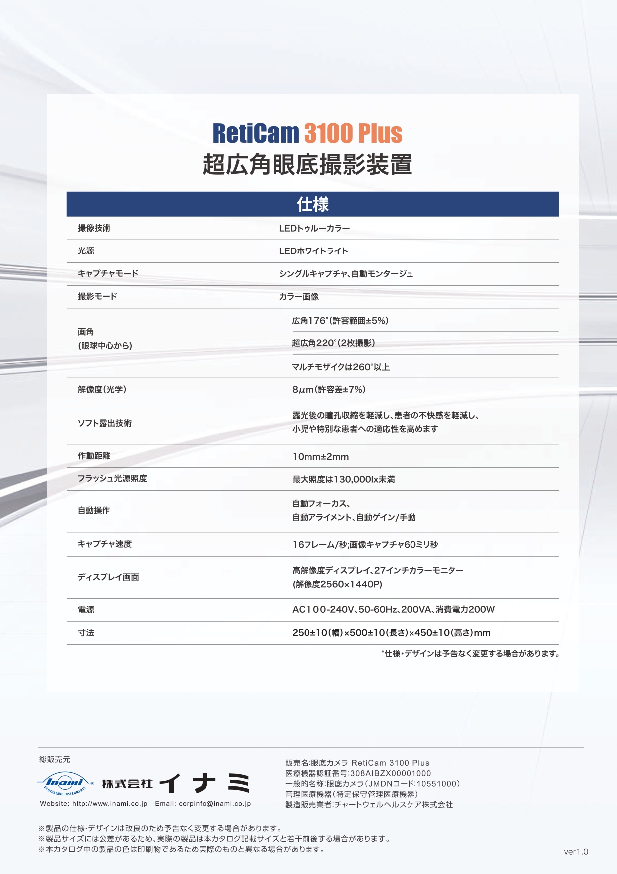 株式会社イナミ 超広角眼底撮影装置 眼底カメラ Reticam 3100 Plus